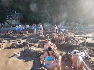 For those who have not been to the Hot Water Beach... there are 2 hot springs about 10 metres apart at the beach which come up from a hot water reservoir some 2 km down in the earth surface, resultant of some volcanic activities some 5-8 million years ago. The spring water temperature can be high as 65 degree C (it actually burns the skin)... a combination of hot spring and cold sea water was a good spa mixture. This is unique to NZ.